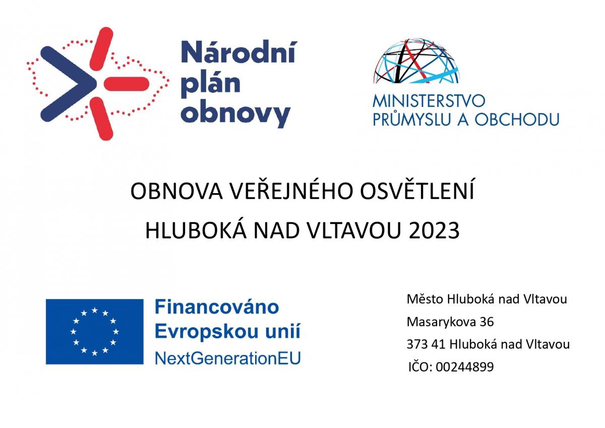 Město Hluboká nad Vltavou v letech 2024-2025 realizovalo projekt s názvem „Obnova veřejného osvětlení v Hluboké nad Vltavou 2023“, jehož cílem bylo zvýšení energetické účinnosti systémů veřejného osvětlení a dosažení úspory elektrické energie. Celkové náklady na tento projekt činily 5 026 342,72 vč. DPH. Na financování projektu získalo město Hluboká nad Vltavou dotaci ve výši 4 000 000 Kč z Ministerstva průmyslu a obchodu České republiky v rámci programu Národního plánu obnovy – NPO komponenta 2.2.2., výzva č. NPO 1/2022. Projekt byl financován z prostředků Evropské Unie. Rekonstrukci veřejného osvětlení ve městě Hluboká nad Vltavou zajistila firma E.ON Energy Solutions, s.r.o. V rámci tohoto projektu bylo do stávající kabelové soustavy osazeno 14 nových sloupů veřejného osvětlení se svítidlem a nainstalováno celkem 326 ks osvětlovacích těles. Práce byly dokončeny na začátku února 2025 a předání dokončeného díla proběhlo dne 14.2.2025. Cílem bylo snížení spotřeby elektrické energie soustavy veřejného osvětlení o 135,128 MWh.