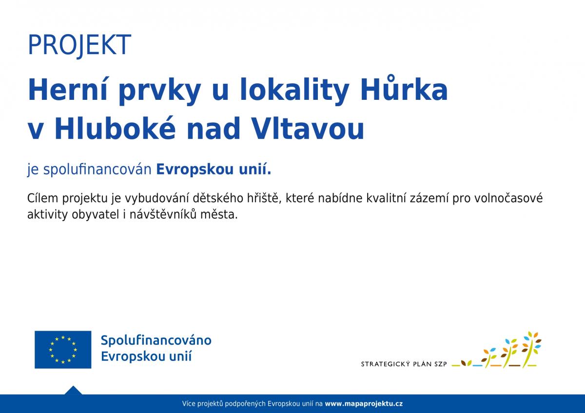 Díky podpoře Místní akční skupiny Hlubocko – Lišovsko a dotaci ze Strategického plánu SZP jsme úspěšně dokončili projekt „Herní prvky u lokality Hůrka v Hluboké nad Vltavou“.
